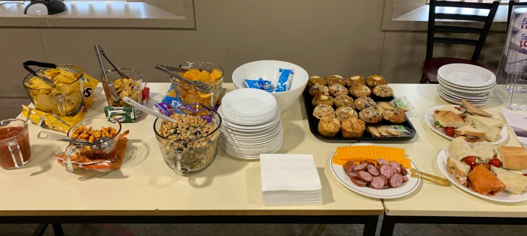 Doors open at 4:30 and guests can enjoy healthy snacks, beverages, and live music. They can also access our free food table that includes non-perishable items and bread products. At 5pm, dinner is served – garlic bread, ceasar salad, homemade spaghetti sauce on hot noodles with parmesan cheese if you want it! Vegan and gluten free options available upon special request.