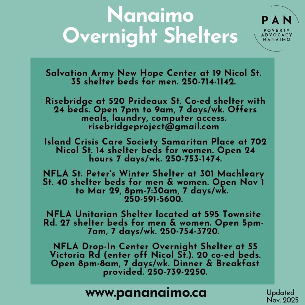 Nanaimo Unitarian Shelter: 27 shelter beds for men and women. Located at 595 Townsite Road.