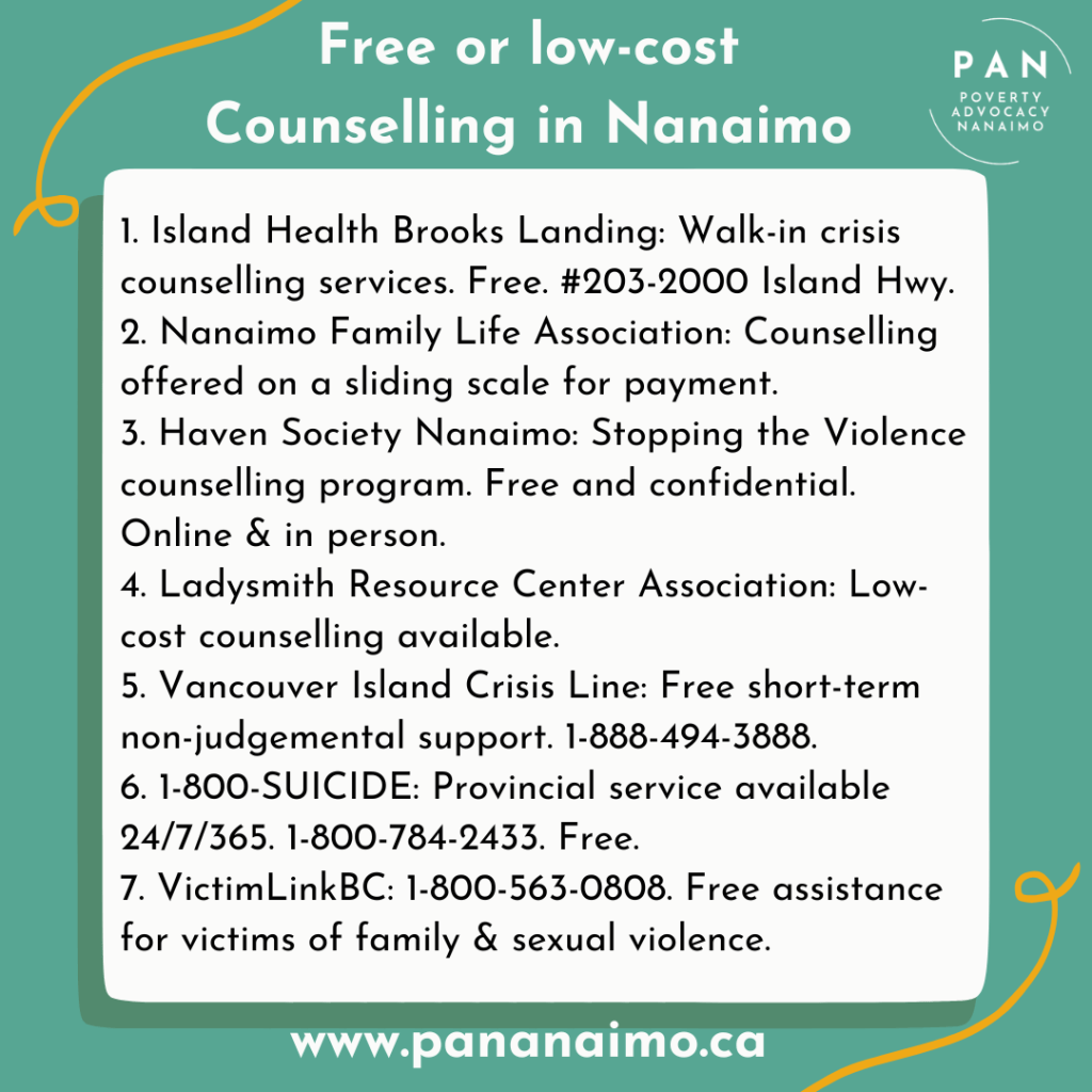 Island Community Counselling: Offers counselling sessions on a sliding scale.