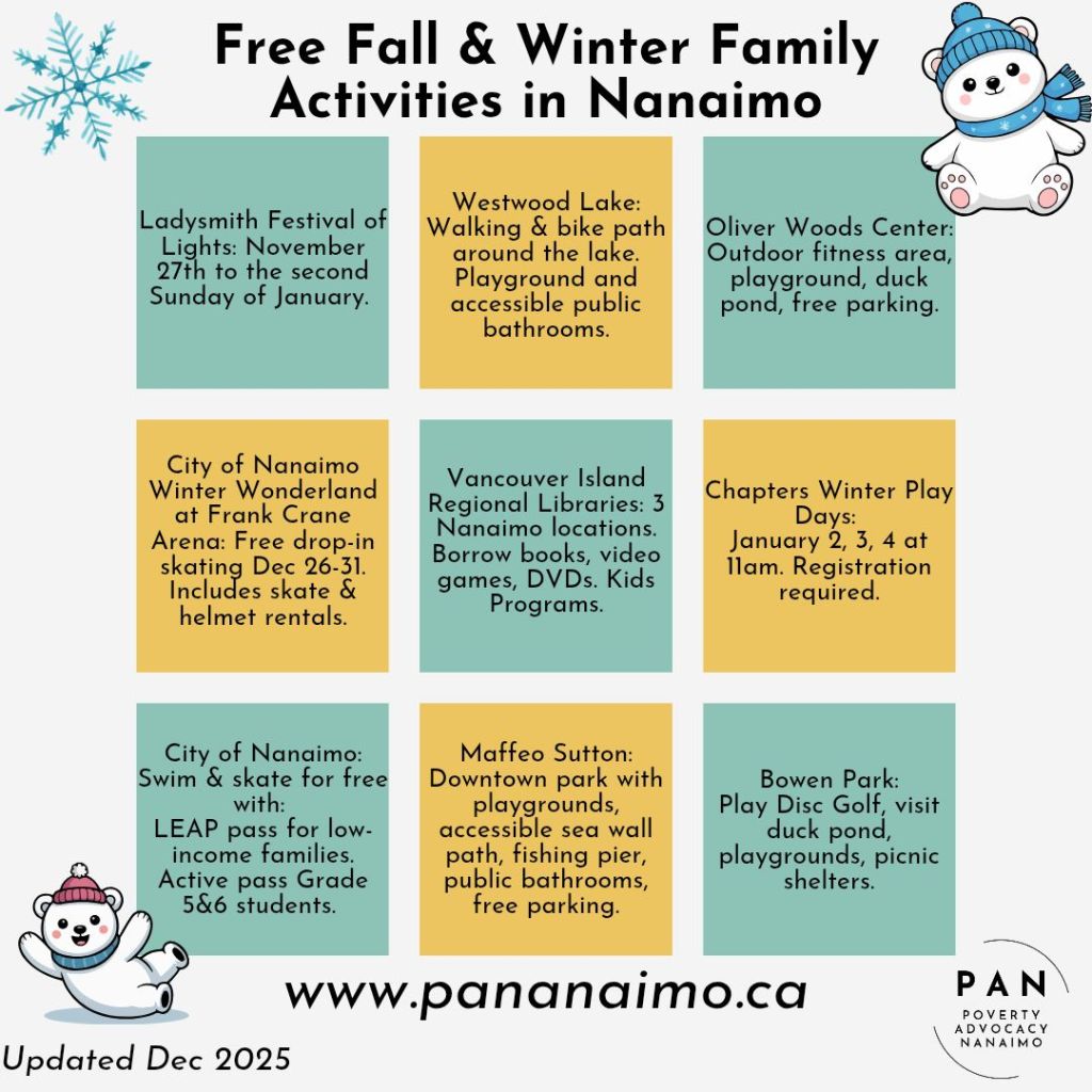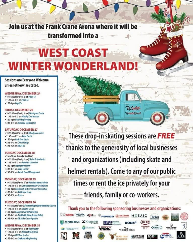City of Nanaimo Winter Wonderland 2025: December 24, 26-31. FREE drop-in skating sessions at Frank Crane Arena. Includes skate and helmet rentals. Visit the link for schedules.