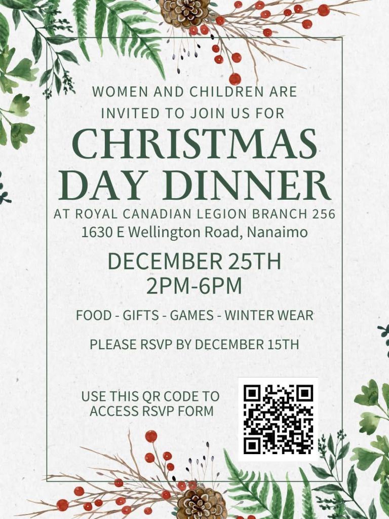 Christmas Day Free Turkey Dinner for Women and Children: Presented by Rising Hope Community Kitchen and Royal Canadian Legion Branch 256. December 25th 2pm to 6pm. Santa visit, food, gifts, games, winter wear exchange. Located at 1630 E Wellington Road. Seating is limited. RSVP by Dec 23rd to this link: https://forms.gle/QG1e8uiCHbWHevAG6