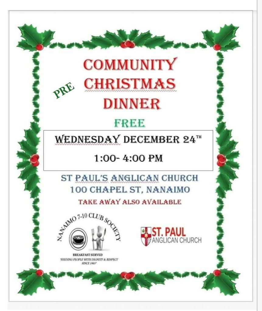 Community Christmas Dinner presented by Nanaimo 7-10 Society: Wednesday December 24th, 1pm to 4pm at St. Paul’s Anglican Church. Take away also available.