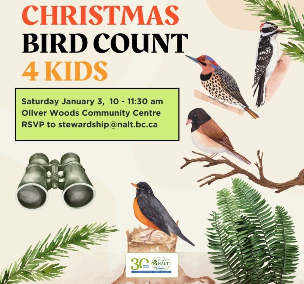 Nanaimo Area Land Trust Christmas Bird Count 4 Kids: Saturday January 3rd, 10am to 11:30am. Oliver Woods Community Center in the Tree Frog room. For kids aged 5 to 12. Short presentation about birds, then walk around the nearby marsh. Bring binoculars if you wish. RSVP to stewardship@nalt.bc.ca