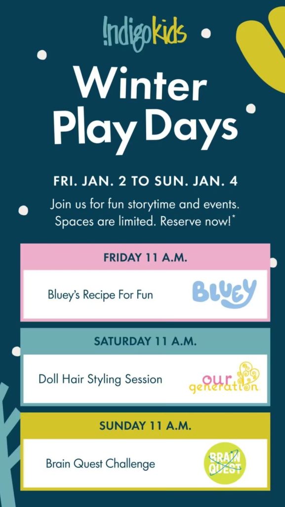 Chapters Nanaimo Winter Play Days: January 2, 3 and 4th at 11am. Registration required. Cost is $5 but every attendee receives a $5 Chapters Gift Card.